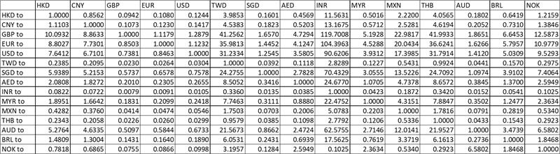 Please find below our most up to date exchange rates. We will be using these when compiling your statement or transferring funds across accounts held in different currencies.